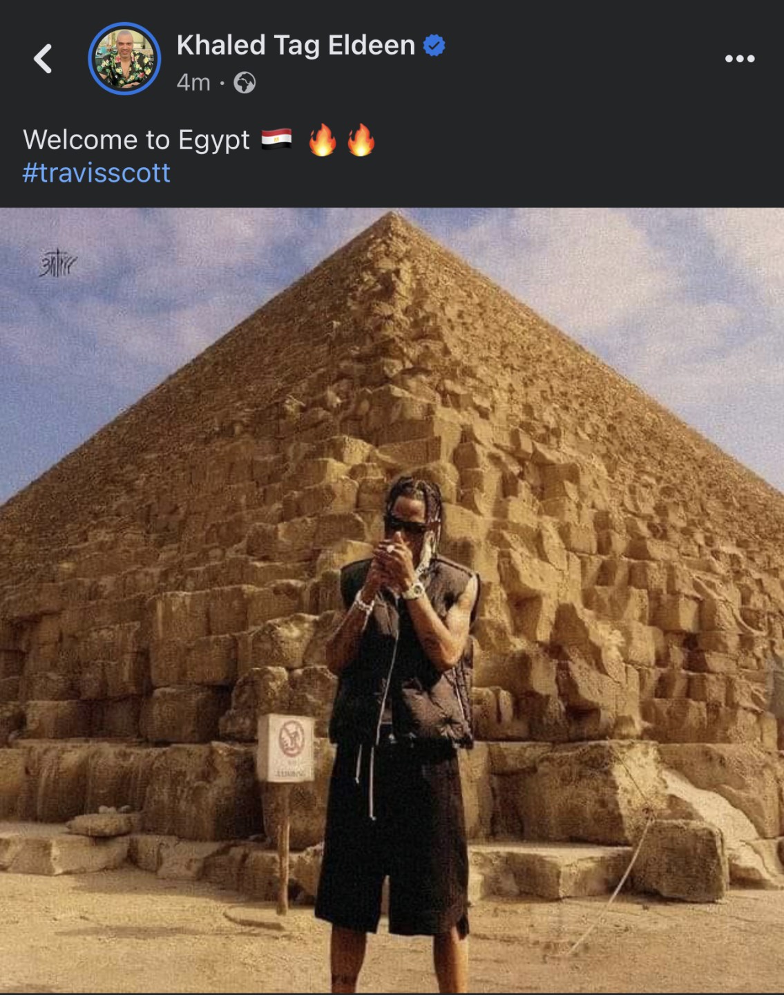 نشر منذ قليل الشاعر خالد تاج الدين، صورة لمطرب الراب الأمريكي ترافيس سكوت، أثناء تواجده في مصر، وذلك من خلال حسابه الشخصي على موقع التواصل الاجتماعي الفيسبوك.