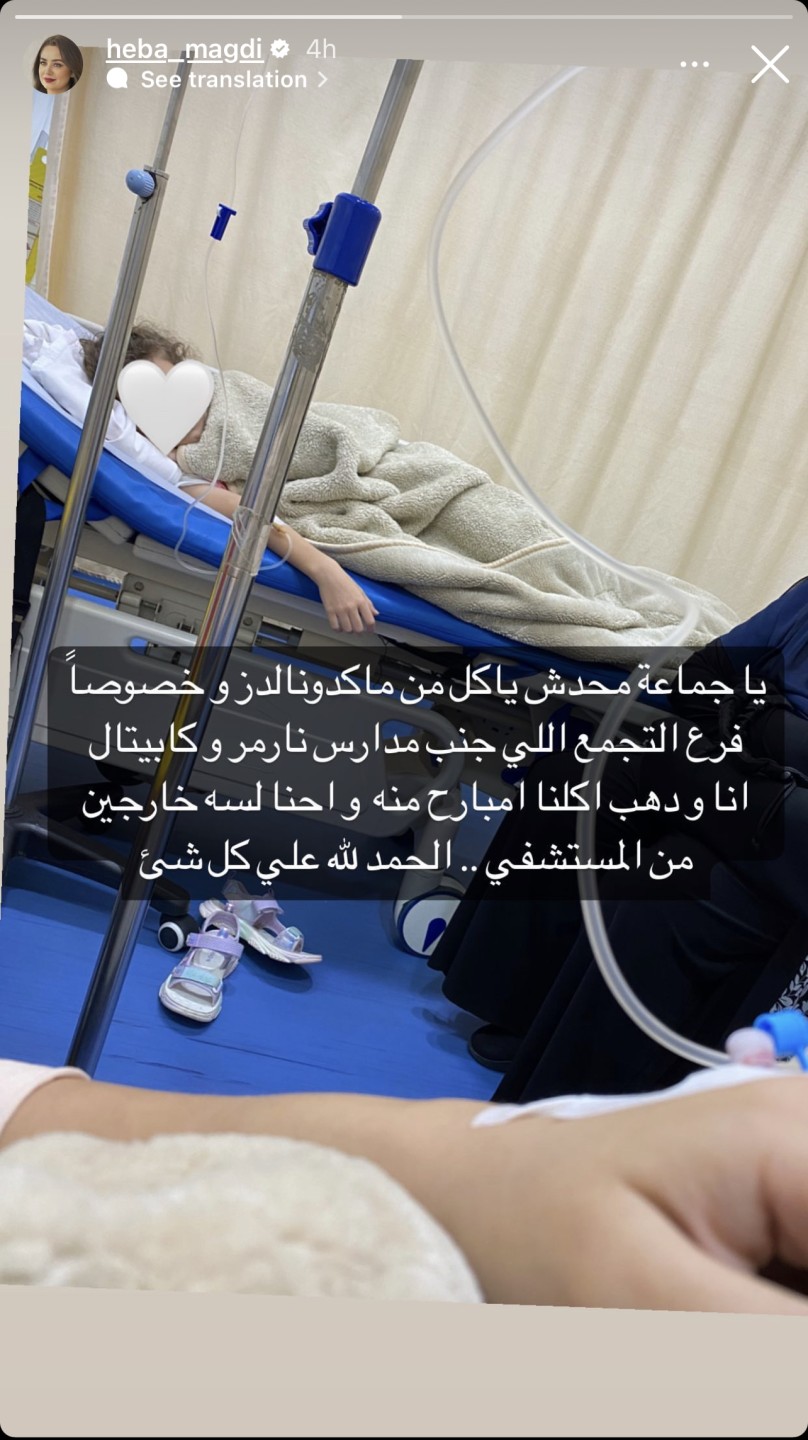 وعلقت هبه مجدي على الصورة من خلال حسابها الرسمي على موقع التواصل الاجتماعي "إنستجرام": "يا جماعة محدش ياكل من ماكدونالدز وخصوصا فرع التجمع اللي جمب مدارس نارمر وكابيتال، أنا ودهب أكلنا امبارح منه واحنا لسه خارجين من المستشفى.. الحمد لله على كل شيء".