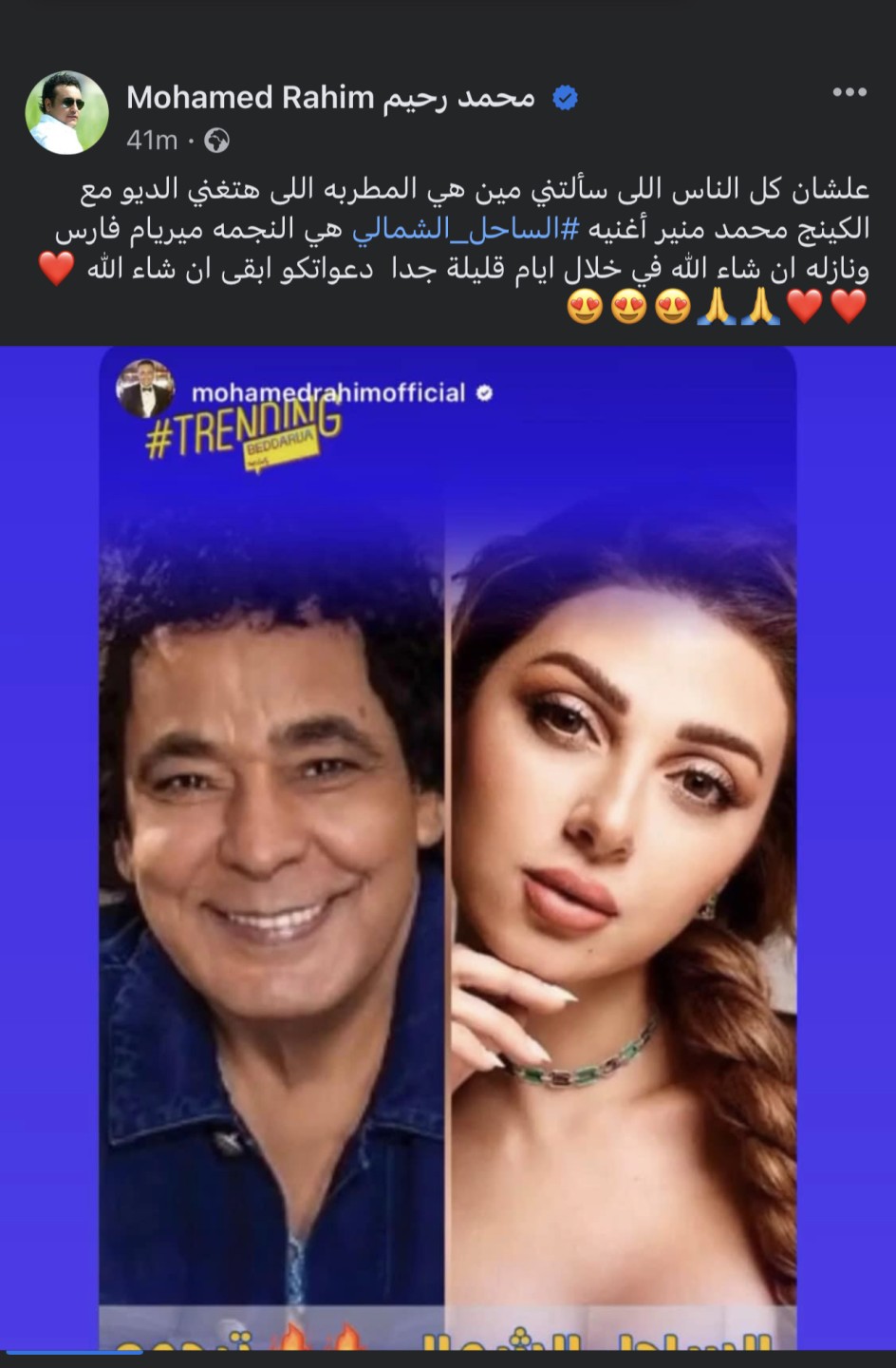 وكتب محمد رحيم، من خلال حسابه الرسمى على موقع التواصل الاجتماعى الفيسبوك، قائلا: "علشان كل الناس اللى سألتني مين هي المطربة اللى هتغني الديو مع الكينج محمد منير أغنية الساحل الشمالي هي النجمة ميريام فارس ونازلة إن شاء الله في خلال أيام قليلة جدا، دعواتكو بقى".