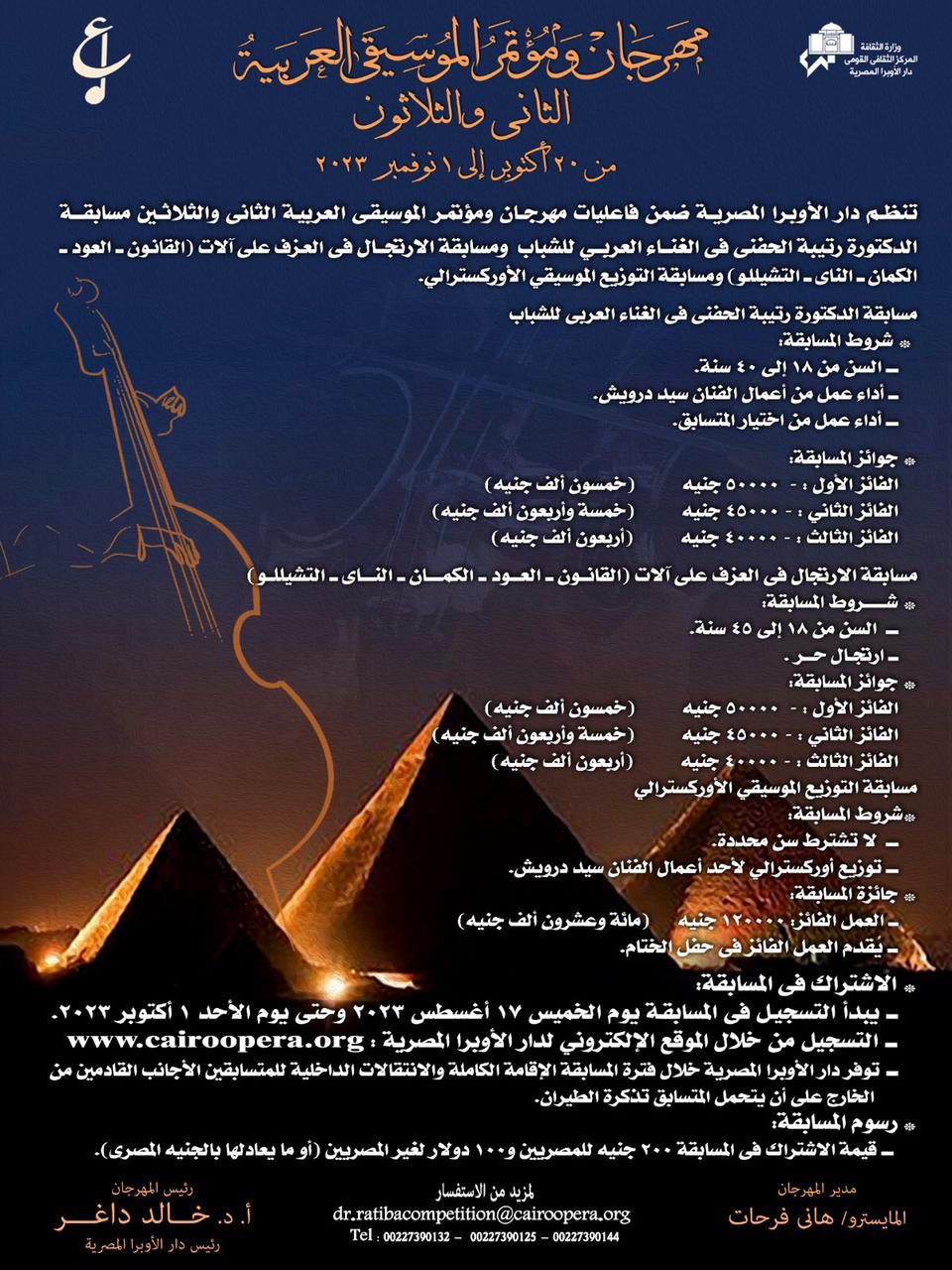 اعتمدت الدكتورة نيفين الكيلانى، وزيرة الثقافة شروط المسابقة المصاحبة لفعاليات الدورة 32 من مهرجان ومؤتمر الموسيقى العربية الذى تنظمه دار الأوبرا المصرية برئاسة الدكتور خالد داغر ويديره المايسترو هانى فرحات، ويقام فى الفترة من 20 أكتوبر حتى 1 نوفمبر المقبل .