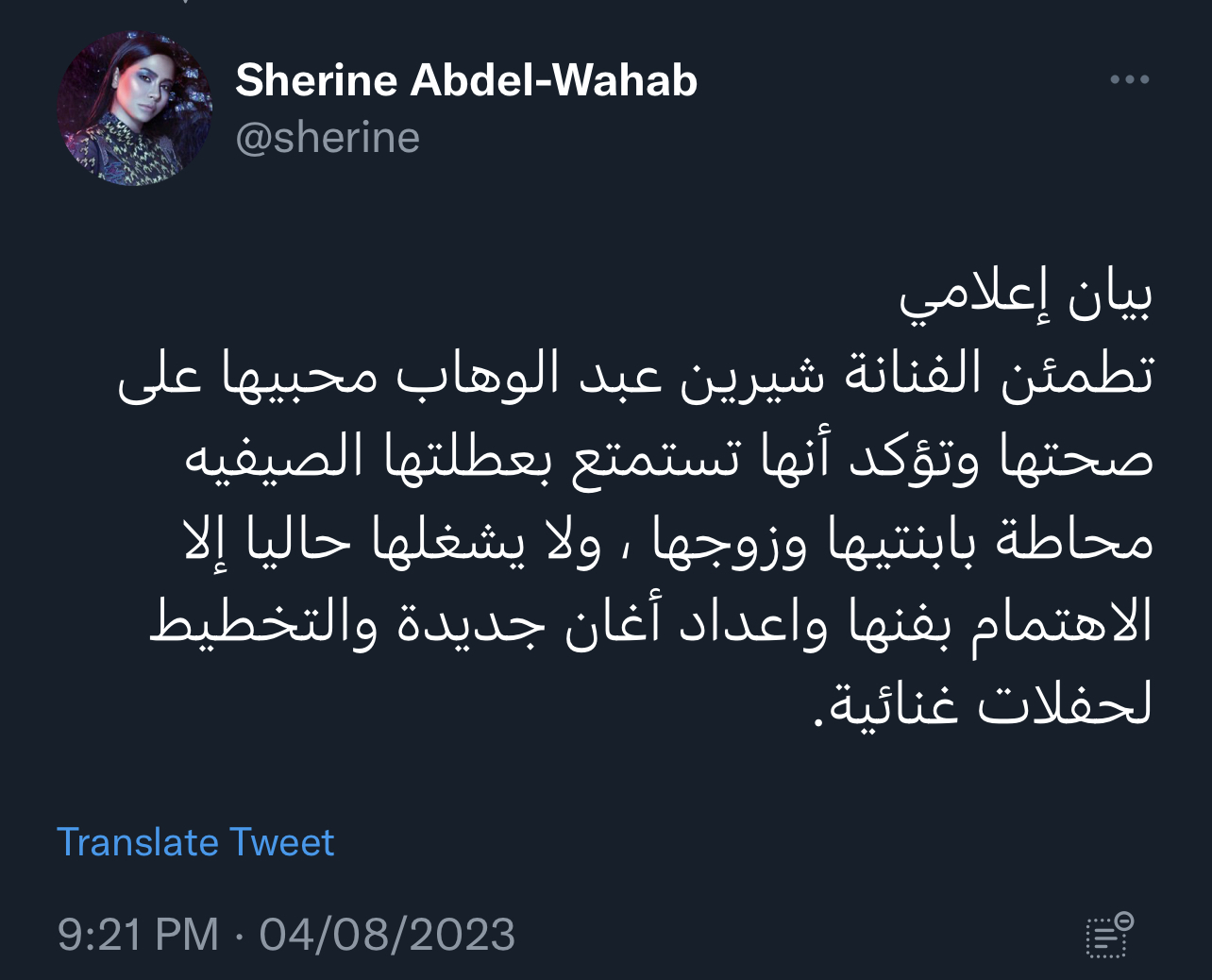 وكتبت شيرين: بيانًا إعلاميًا، ‏لتطمئن محبيها على صحتها، وتؤكد أنها تستمتع بعطلتها الصيفية محاطة بابنتيها وزوجها، ولا يشغلها حاليا إلا الاهتمام بفنها وإعداد أغان جديدة والتخطيط لحفلات غنائية.