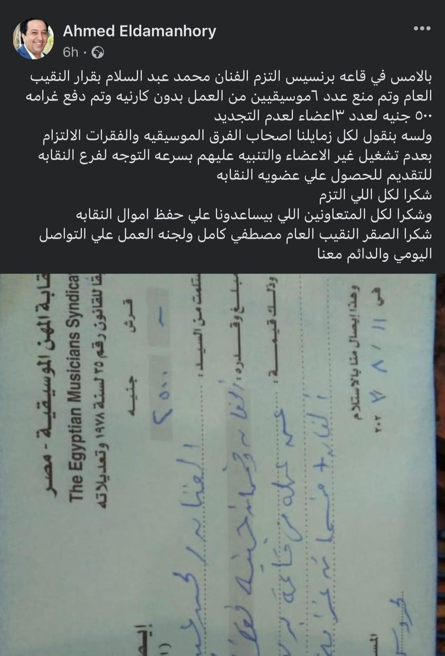 وكتب أحمد الدمنهوري، من خلال حسابه الرسمي على موقع التواصل الاجتماعي "فيسبوك": "بالأمس في قاعة برنسيس، إلتزم الفنان محمد عبد السلام بقرار النقيب العام وتم منع عدد 6 موسيقيين من العمل، بدون كارنيه، وتم دفع غرامة 500 جنيه، لعدد 3 أعضاء، لعدم التجديد".