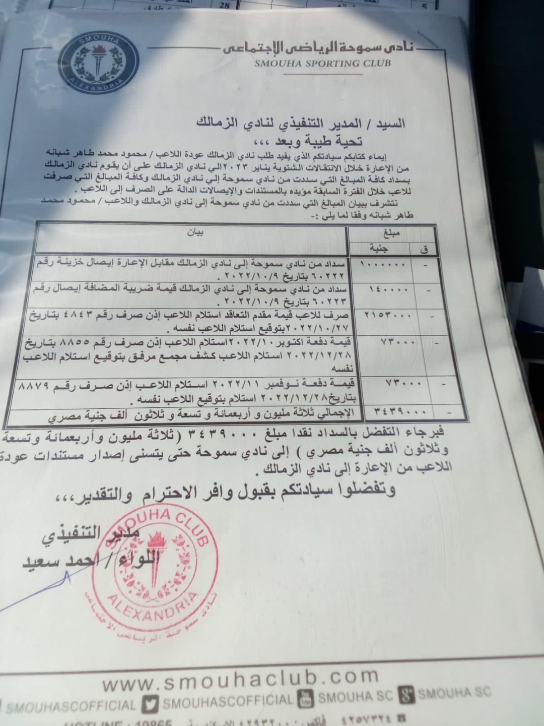 وكشفت مصادر من داخل نادي سموحة عن المستندات الخاصة بالمديونية والتي دفعت فرج عامر لإعلانه تقديم شكوى الزمالك لاتحاد الكرة، والتي تتمثل في أزمة اللاعب محمود شبانة المعار من الزمالك لسموحة.