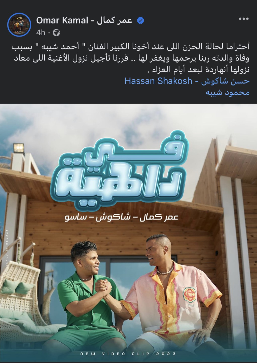 وكتب عمر كمال من خلال حسابه الرسمى على موقع التواصل الاجتماعى فيسبوك، "احتراما لحالة الحزن اللى عند أخونا الكبير الفنان " أحمد شيبة " بسبب وفاة والدته ربنا يرحمها ويغفر لها .. قررنا تأجيل نزول الأغنية اللى معاد نزولها أنهاردة لبعد أيام العزاء.