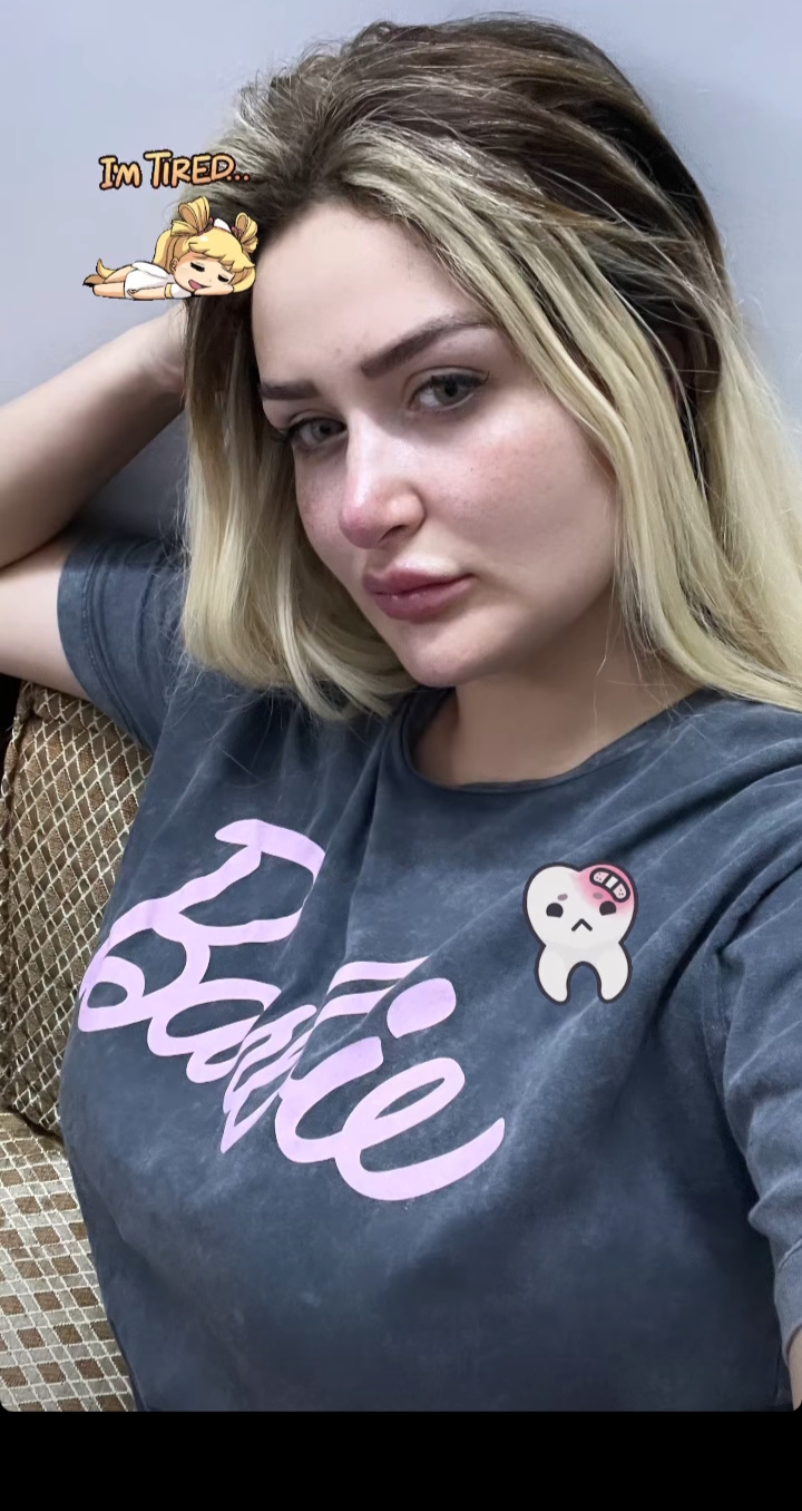وظهرت التونسية رانيا التومي في الصورة، تركت خصلات شعرها الأشقر منسدلا على كتفها وأوضحت أنها تشتكي من الألم في أسنانها.