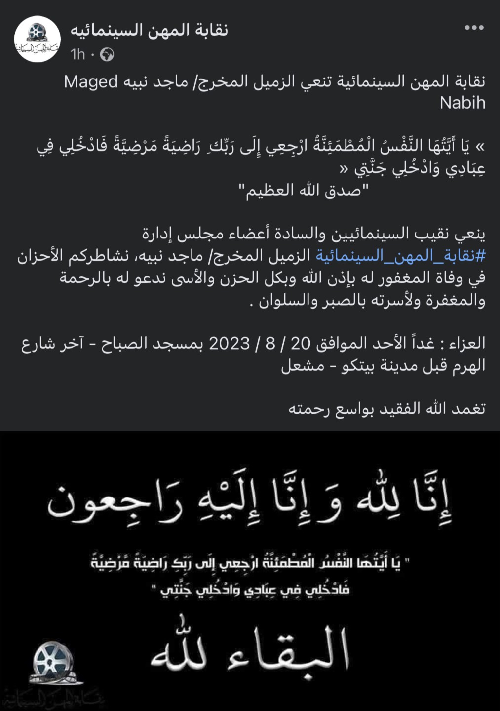 وكتبت الصفحة: نقابة المهن السينمائية تنعى الزميل المخرج/ ماجد نبيه، «يَا أَيَّتُهَا النَّفْسُ الْمُطْمَئِنَّةُ ارْجِعِي إِلَى رَبِّك ِ رَاضِيَةً مَرْضِيَّةً فَادْخُلِي فِي عِبَادِي وَادْخُلِي جَنَّتِي».