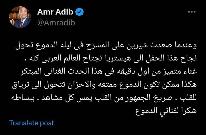 وأشاد أديب في تغريدة له على منصة "إكس" -تويتر سابقًا- بما قدمته شيرين عبد الوهاب، قائلًا: "عندما صعدت شيرين على المسرح فى ليله الدموع تحول نجاح هذا الحفل إلى هيستريا تجتاح العالم العربى كله".