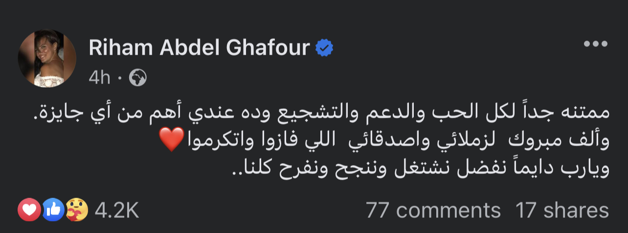 وكتبت ريهام عبد الغفو، من خلال حسابها على موقع التواصل الاجتماعى "الفيسبوك"، قائلة: "ممتنة جداً لكل الحب والدعم والتشجيع وده عندي أهم من أي جايزة، وألف مبروك لزملائي واصدقائي اللي فازوا واتكرموا، ويارب دايماً نفضل نشتغل وننجح ونفرح كلنا.