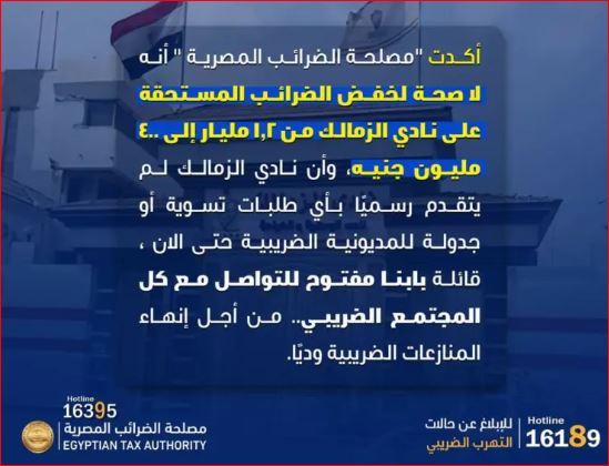 أكدت “مصلحة الضرائب المصرية ” أنه لا صحة لخفض الضرائب المستحقة على نادي الزمالك من ١,٢ مليار إلى ٤٠٠ مليون جنيه، وأن نادي الزمالك لم يتقدم رسميًا بأي طلبات تسوية أو جدولة للمديونية الضريبية حتى الان.
