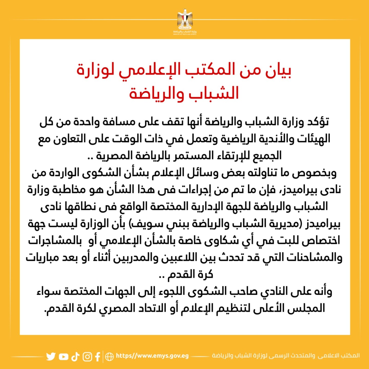 وبخصوص ما تناولته بعض وسائل الإعلام بشأن الشكوى الواردة من نادي بيراميدز، فإن ما تم من إجراءات في هذا الشأن هو مخاطبة وزارة الشباب والرياضة للجهة الإدارية المختصة الواقع في نطاقها نادي بيراميدز (مديرية الشباب والرياضة ببني سويف) بأن الوزارة ليست جهة اختصاص للبت في أي شكاوى خاصة بالشأن الإعلامي أو بالمشاجرات والمشاحنات التي قد تحدث بين اللاعبين والمدربين أثناء أو بعد مباريات كرة القدم.