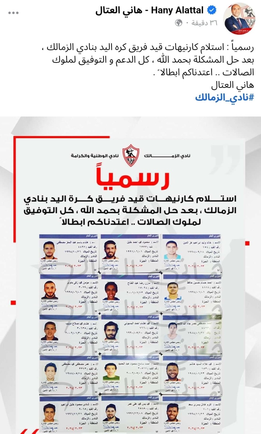 وكتب هاني العتال عبر حسابه الرسمي على فيس بوك : رسمياً .. استلام كارنيهات قيد فريق كرة اليد بنادي الزمالك ، بعد حل المشكلة بحمد الله ، كل الدعم و التوفيق لملوك الصالات .. اعتدناكم ابطالا ً.