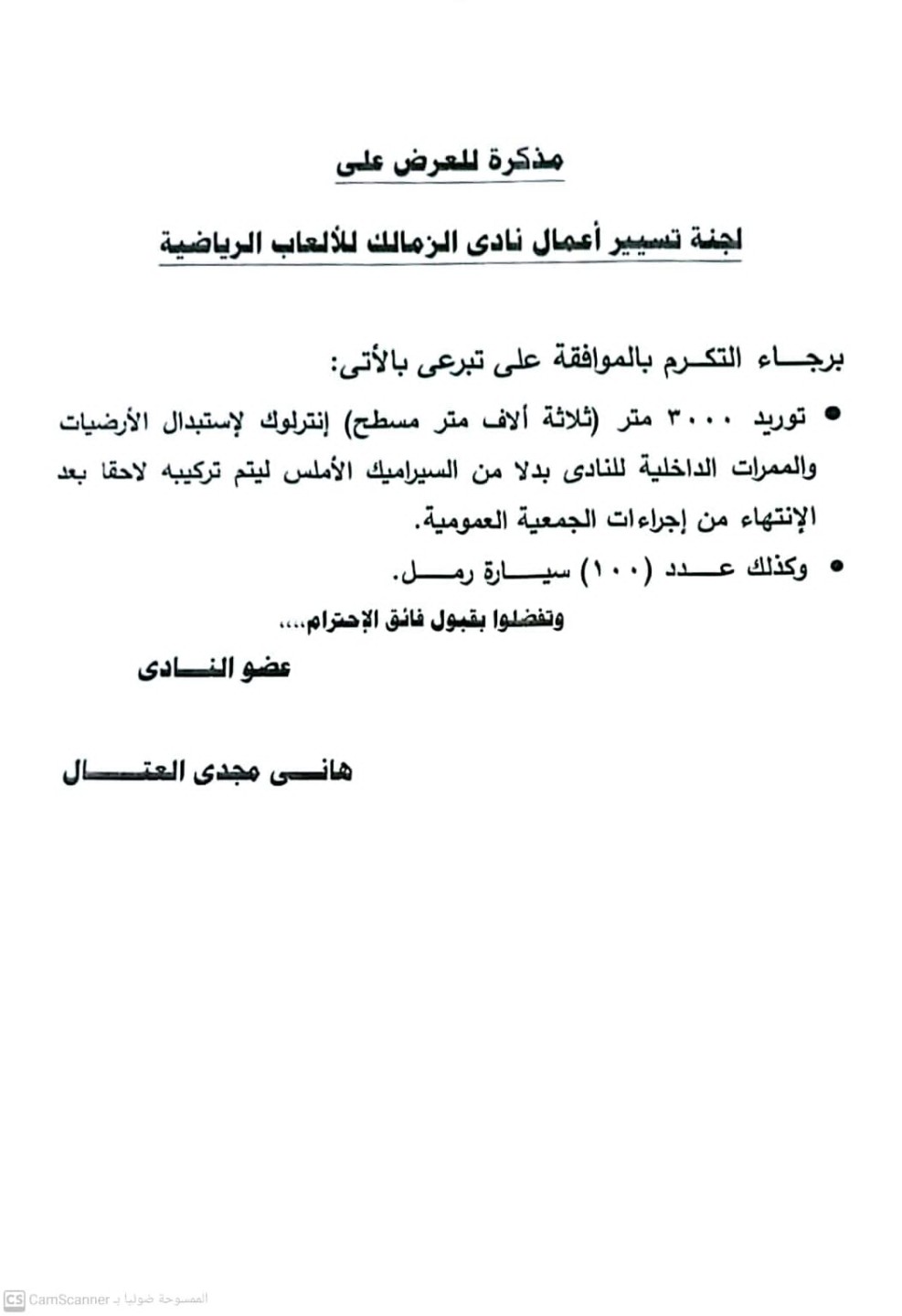 وشهد الطلب الذي تقدم به هاني العتال إلى عماد البناني تقديم 3 آلاف متر إنترلوك ليتم وضعها بدلا من السيراميك الموجود في النادي والذي يتسبب في إيذاء جميع أعضاء النادي إلى جانب أنه أصبح غير جيد وبه كسور كثيرة.