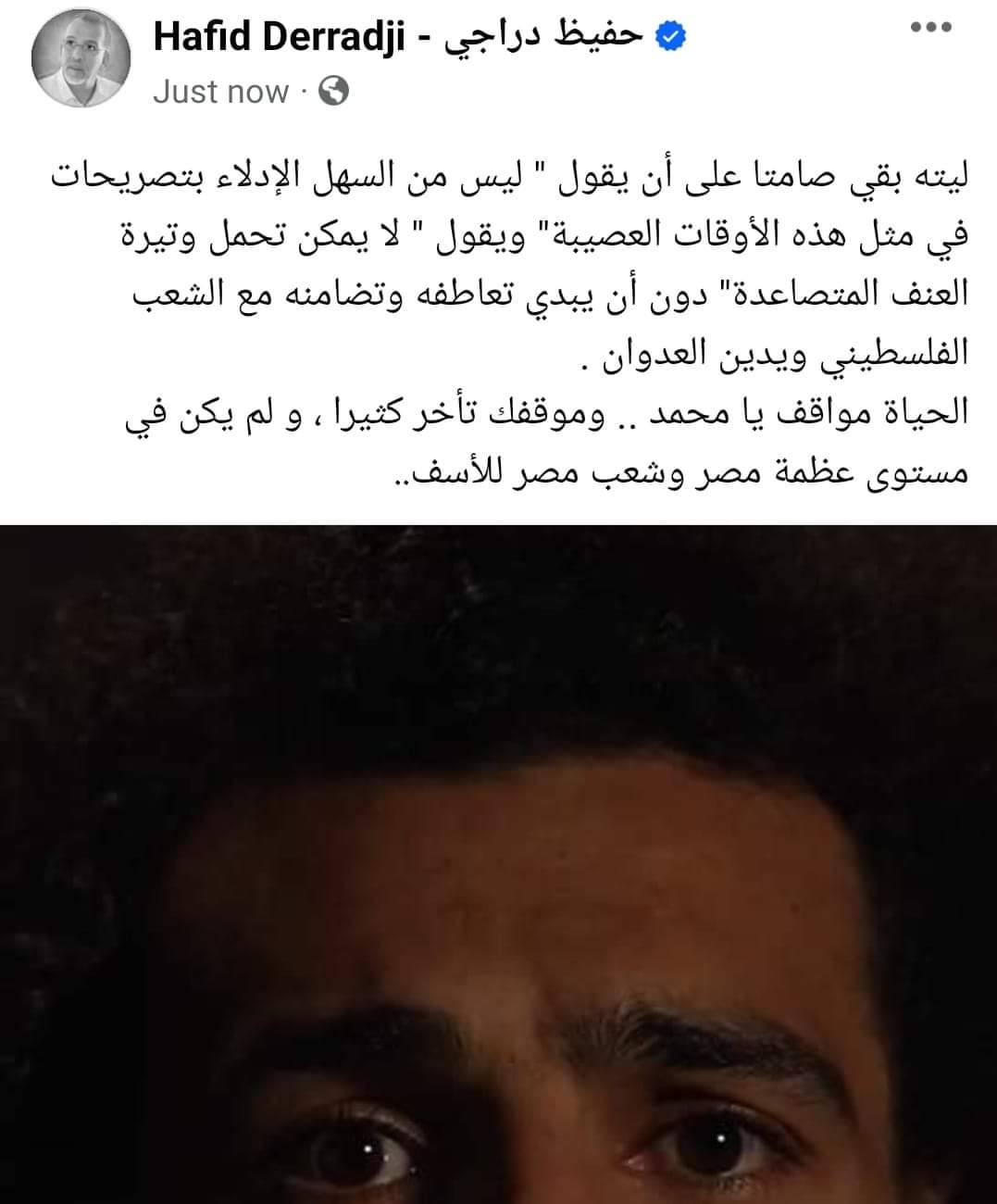 انتقد المعلق الجزائري حفيظ دراجي، رسالة محمد صلاح نجم ليفربول الإنجليزي، والتي أطلقها إلى العالم لوقف الحرب على غزة بعد القصف العنيف الذي يتعرض له القطاع من قوات الاحتلال الإسرائيلية.