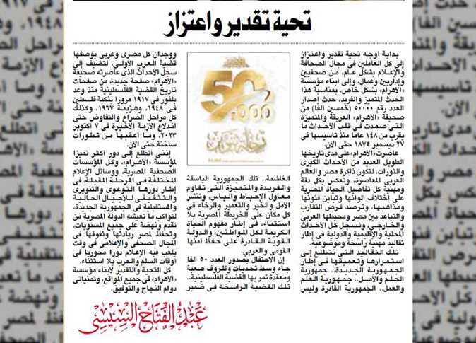 ومما جاء في الكلمة: «تحية تقدير واعتزاز إلى كل العاملين في مجال الصحافة والإعلام بشكل عام، من صحفيين وإداريين وعمال، وإلى أبناء مؤسسة «الأهرام» بشكل خاص بمناسبة هذا الحدث المتميز والفريد، حدث إصدار العدد رقم 50000 (خمسين ألفًا) من صحيفة الأهرام العريقة والمتميزة التي صمدت في قلب الأحداث ما يقرب من 148 عاما منذ تأسيسها في 27 ديسمبر 1875 حتى الآن».