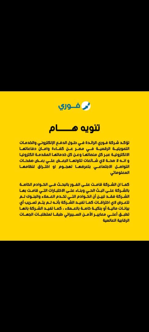 وفي حين، نفت شركة فوري تعرضها لأي اختراق إلكتروني مؤكدة أن دفاعاتها تعمل بكفاءة وأمان عبر كل منصاتها، مؤكدة أنه لا صحة لأي شائعات تناولها البعض على بعض صفحات التواصل الاجتماعي بتعرضها لهجوم أو اختراق لنظامها المعلوماتي.