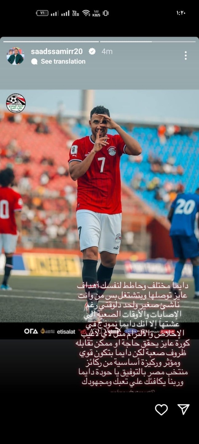 أرسل سعد سمير، لاعب الفريق الكروي الأول بنادي سيراميكا كليوباترا الحالي، رسالة خاصة إلى الدولي محمود حسن تريزيجيه، لاعب طرابزون سبور التركي ومنتخب مصر، بعد تألقه مع الفراعنة.
