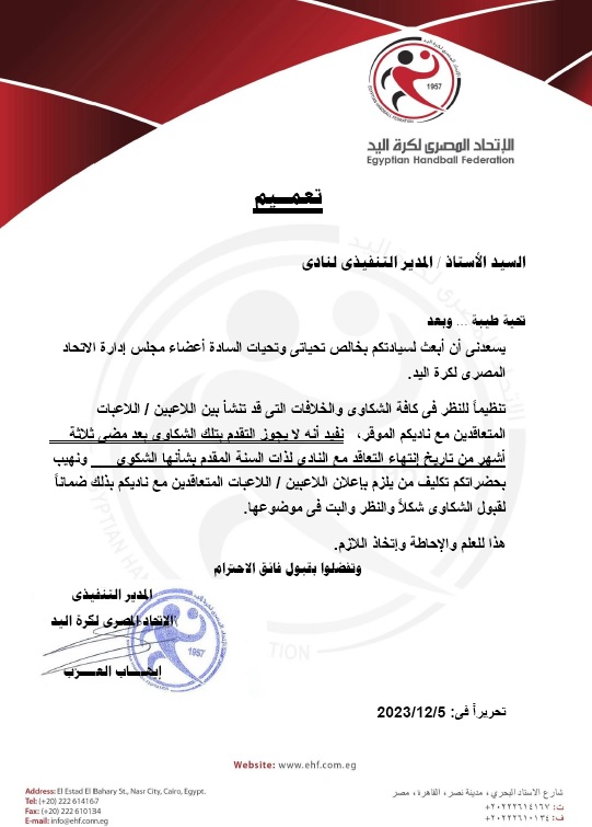 وأكد الاتحاد المصري لكرة اليد، في بيان رسمي: "تعميم علي جميع الأندية، بخصوص الشكاوي المقدمة من اللاعبين واللاعبات، تنظيمًا للنظر في كافة الشكاوي والخلافات التي قد تنشأ بين اللاعبين/ اللاعبات المتعاقدين مع ناديكم الموقر، نفيد أنه لا يجوز التقدم بتلك الشكاوي بعد مضي ثلاثة أشهر من تاريخ انتهاء التعاقد مع النادي لذات السنة المقدم بشأنها الشكوى".