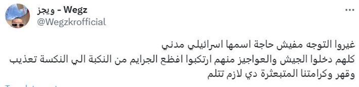 نشر مغني الراب ويجز تغريدة على حسابه الخاص بموقع "إكس" عبر فيها عن الأحداث الأخيرة التي وقعت في غزة ومن يدافع عن المدنين في إسرائيل، قائلاً: "غيروا التوجه مفيش حاجة اسمها إسرائيلي مدني ... كلهم دخلوا الجيش والعواجيز منهم ارتكبوا أفظع الجرايم من النكبة إلى النكسة، تعذيب وقهر وكرامتنا المتبعثرة دي لازم تتلم".