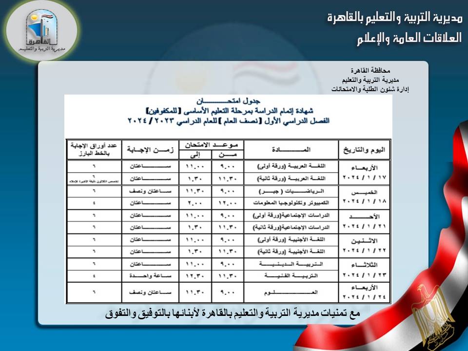 اعتمد اللواء خالد عبدالعال، محافظ القاهرة، اليوم الأحد، جدول امتحانات الفصل الدراسي الأول للعام الدراسي ٢٠٢٤/٢٠٢٣، إذ تجرى الامتحانات خلال الفترة من 2 يناير إلى 24 يناير 2024.