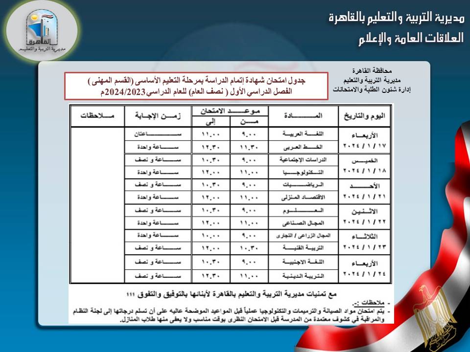 امتحانات الإعدادية العامة والرياضية والصم والمكفوفين والمهنية من الأربعاء 17 يناير حتى الأربعاء 24 يناير.