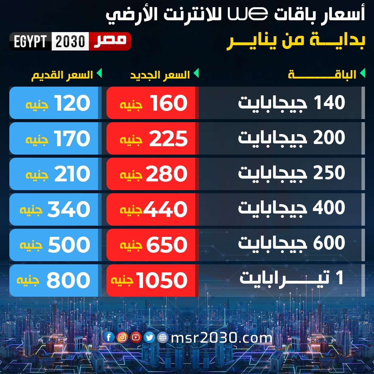 - وباقة 250 جيجابايت بسعر 280 جنيهًا بدلا من 210 جنيهات، وباقة 400 جيجابايت بسعر 440 جنيها بدلا من 340 جنيهًا.