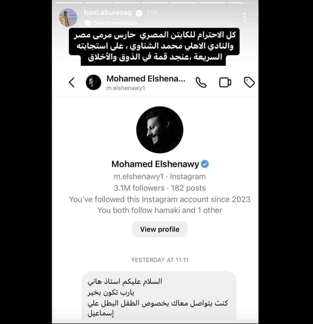 تواصل النجم محمد الشناوي حارس مرمى النادي الأهلي، مع الصحفي الفلسطيني هاني أبو رزق، من أجل تلبية علي إسماعيل المُلقب بـ «الطفل البطل».