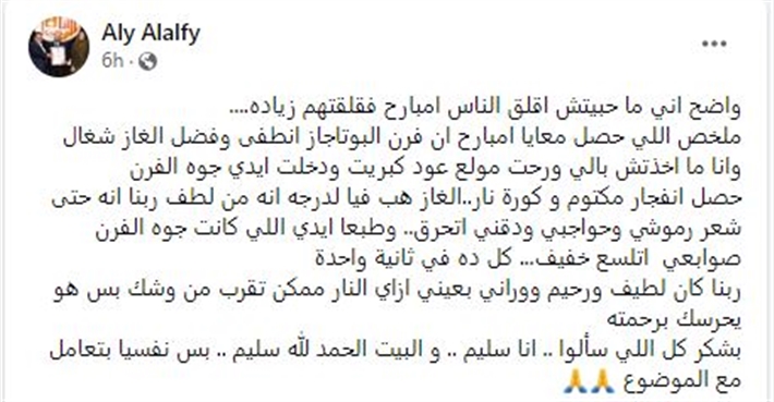 وأضاف علي الألفي: "ربنا كان لطيف ورحيم ووراني بعيني إزاي النار ممكن تقرب من وشك بس هو يحرسك برحمته.. بشكر كل اللي سألوا، أنا سليم، والبيت الحمد لله سليم، بس نفسيا بتعامل مع الموضوع".