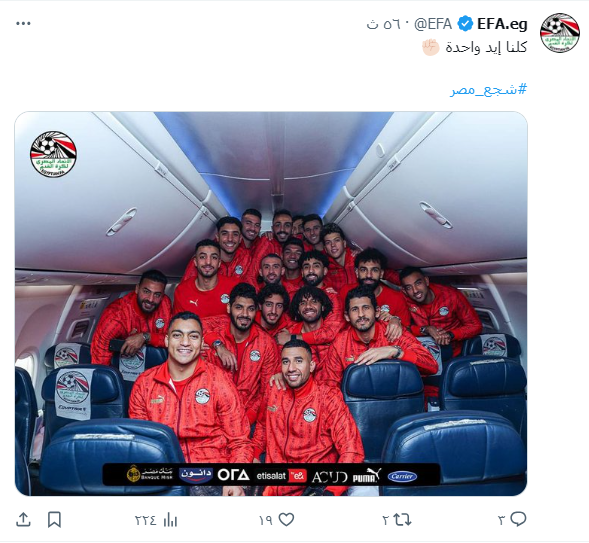 ونشر الحساب الرسمي لاتحاد الكرة عبر موقع التواصل الاجتماعي للتدوينات القصيرة "إكس" صورة للاعبي المنتخب الوطني، وذلك قبل ساعات من انطلاق بطولة كأس الأمم الإفريقية، وعلق عليها: "كلنا إيد واحدة".