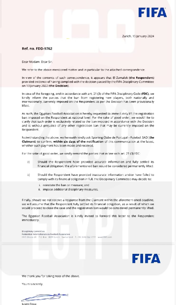 حصلت «بوابة مصر 2030» على خطاب الاتحاد الدولي لكرة القدم «فيفا»، الرسمي لاتحاد الكرة برفع الحظر عن نادي الزمالك بشكل رسمي.