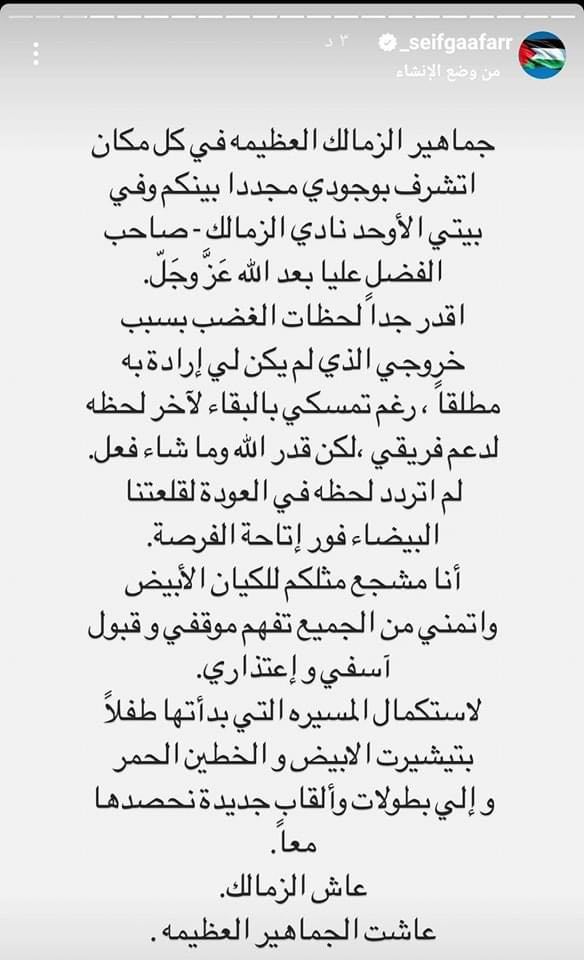 وأتم: لم أتردد لحظة في العودة لقلعتنا البيضاء فور إتاحة الفرصة، أنا مشجع مثلكم للكيان الأبيض وأتمنى من الجميع تفهم موقفي وقبول آسفي واعتذاري، لاستكمال المسيرة التي بدأتها طفلًا بتيشرت الأبيض والخطين الحمر وإلى بطولات وألقاب جديدة نحصدها معًا.