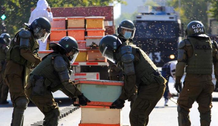أطلق عدد من النحالين فى تشيلى أسرابًا من النحل حوالي 10000 نحلة أمام القصر الرئاسي، بعد أن أحضروا 60 خلية إلى موقع الاحتجاج، ما أدى إلى اعتقالهم.