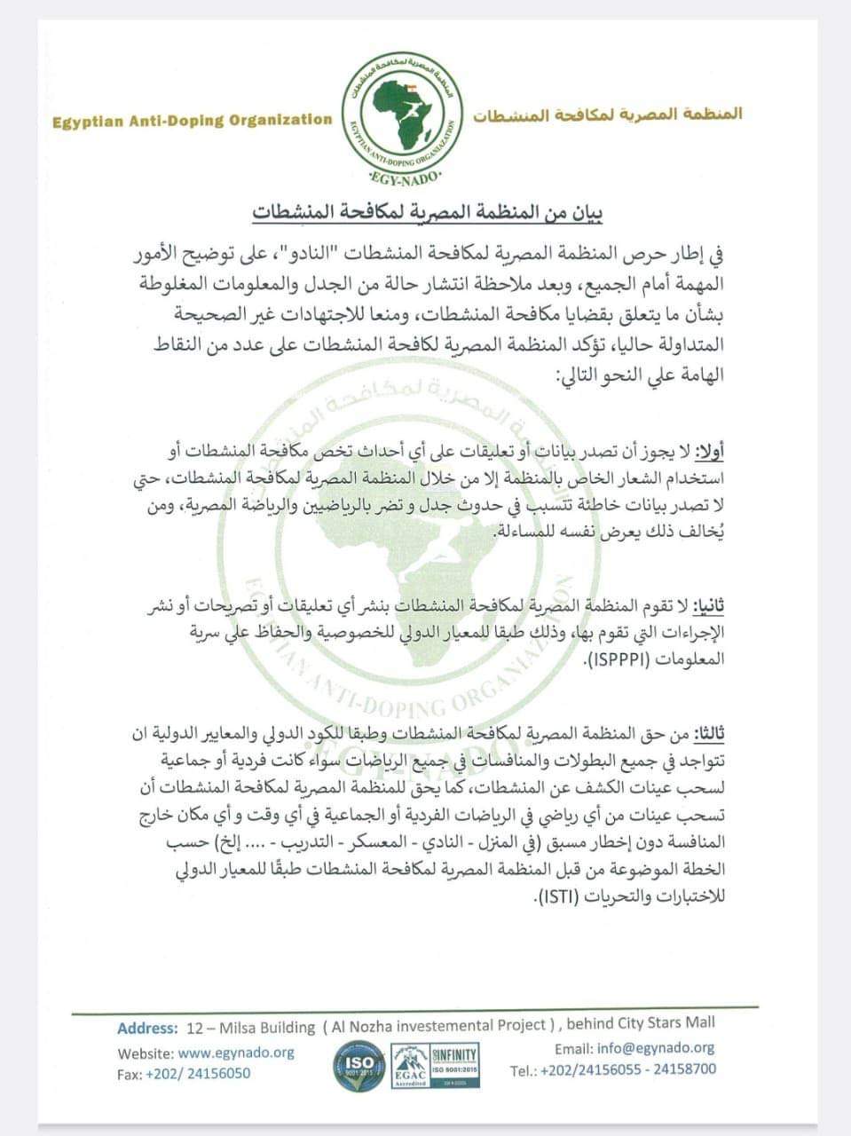 أصدرت المنظمة المصرية لمكافحة المنشطات "النادو"، بيانا رسميا، لتوضيح العديد من الأمور الهامة.