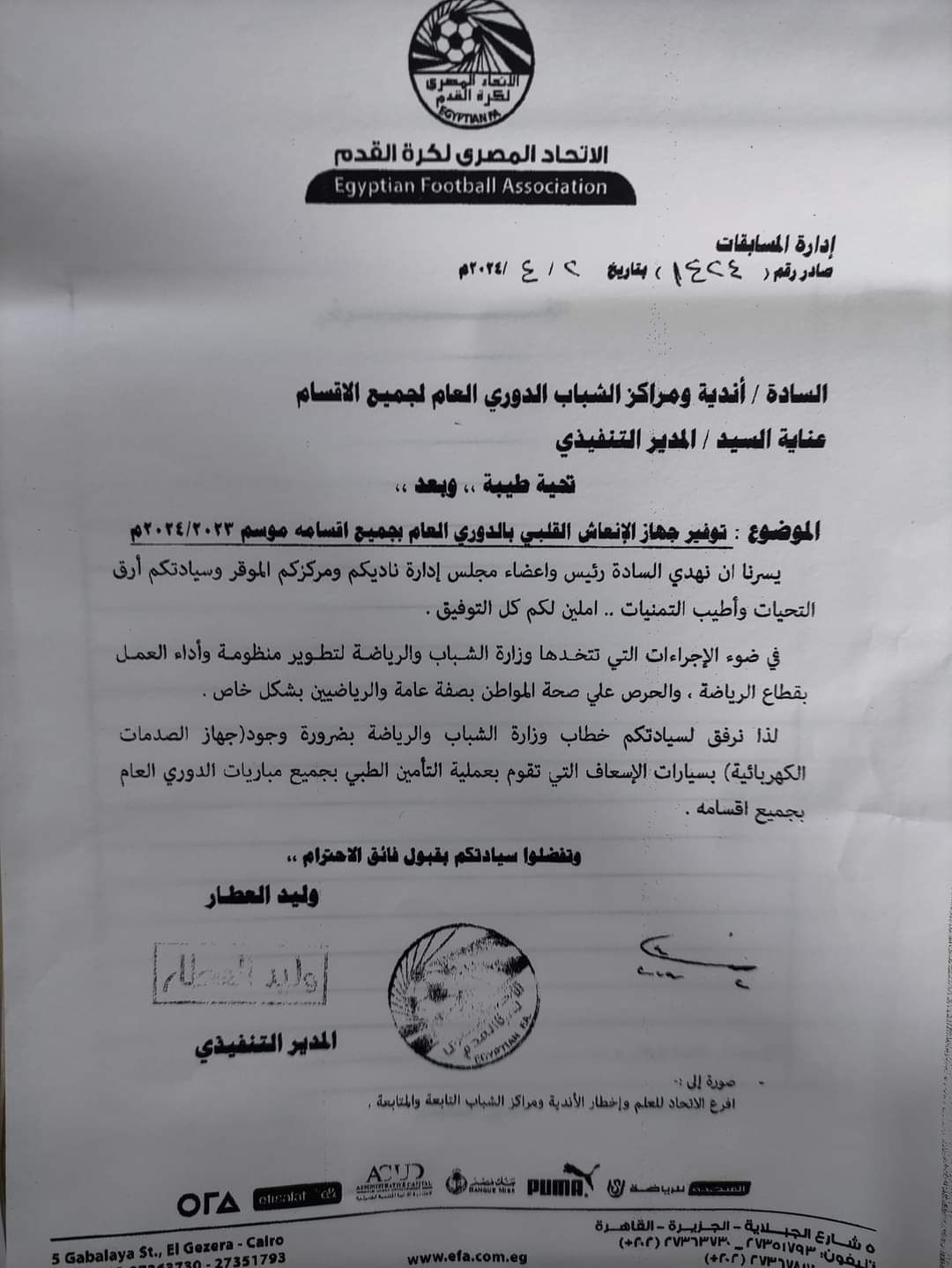 أخطر الاتحاد المصري لكرة القدم رسميا أندية الدوري في جميع الأقسام بتوفير جهاز الإنعاش القلبي "الصدمات الكهربائية" بعد واقعة أحمد رفعت لاعب مودرن فيوتشر.