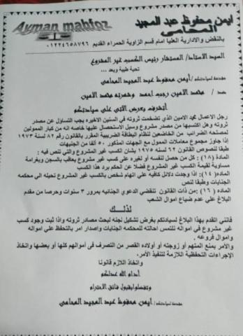 بدأ محفوظ بلاغه، بالتساؤل الذي وصفه بالمشروع عن مصادر ثروة محمد الأمين، وهل اكتسبها من مصدر مشروع من عدمه، وسبل الاستحصال عليها خاصة أنه من كبار الممولين لمصلحة الضرائب من الخاضعين لنظام البطاقة الضريبية المقرر بالقانون رقم 82 لسنة 1973.