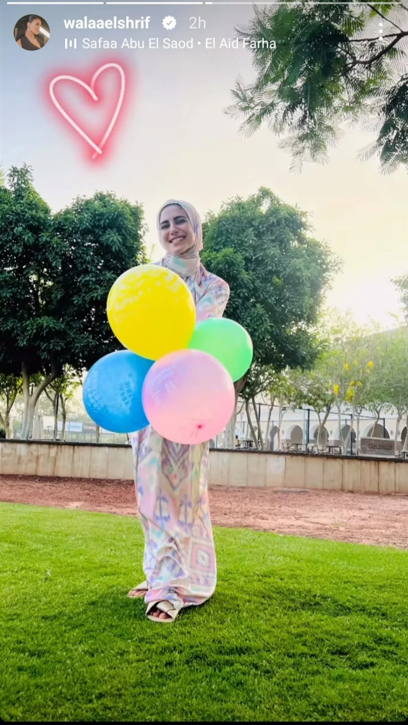 وظهرت ولاء الشريف في الصور بالحجاب أثناء صلاة العيد.