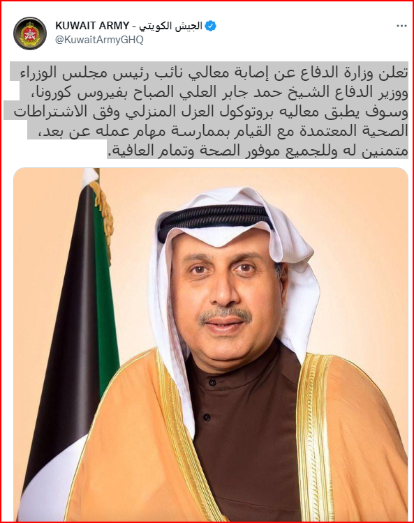 وقال الحساب الرسمي لوزارة الدفاع الكويتية على تويتر"تعلن وزارة الدفاع عن إصابة نائب رئيس مجلس الوزراء ووزير الدفاع الشيخ حمد جابر العلي الصباح بفيروس كورونا".