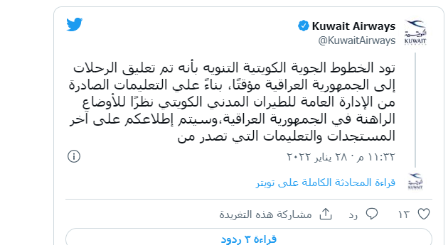 وقالت الخطوط الجوية الكويتية عبر «تويتر»: «تود الخطوط الجوية الكويتية التنويه بأنه تم تعليق الرحلات إلى الجمهورية العراقية مؤقتًا».