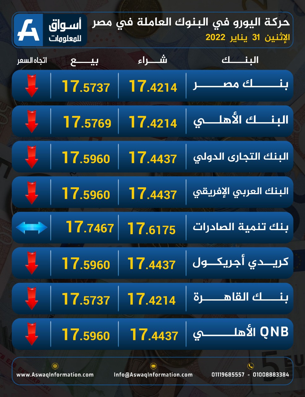 تعرف على سعر اليورو اليوم الإثنين 31-1-2022 في مصر