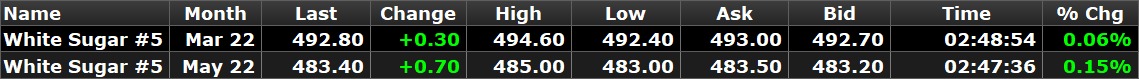 صعدت أسعار العقود الآجلة للسكر الأبيض ببورصة لندن للسلع، حيث ارتفع عقد تداول شهر مارس، بمقدار 0.30 دولارًا، ليصل إلى 492.80 دولارًا للطن.