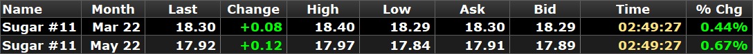ارتفعت العقود الآجلة للسكر الخام في بورصة نيويورك، في بداية تداولات اليوم، حيث ارتفع عقد مارس ليسجل نحو 18.30 سنتًا للرطل بمقدار ارتفاع 0.08 سنتًا .