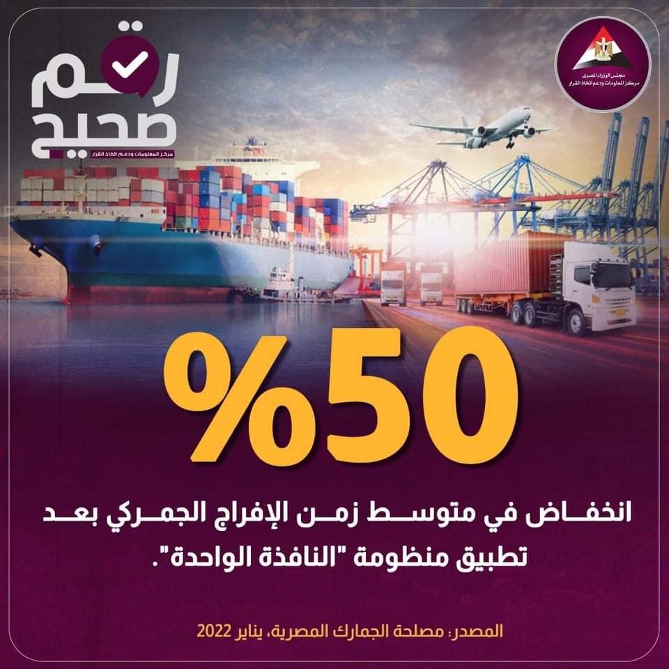 وأوضح الإنفوجراف، أن مصر نجحت في خفض متوسط زمن الإفراج الجمركي بنحو 50%، وذلك بعد تطبيق منظومة "النافذة الواحدة"، والتي تربط جميع المواني بمنصة إلكترونية موحدة -"منصة_نافذة"-، والتي قلصت زمن وصول المستندات.