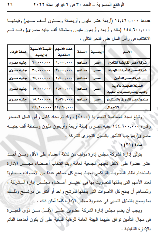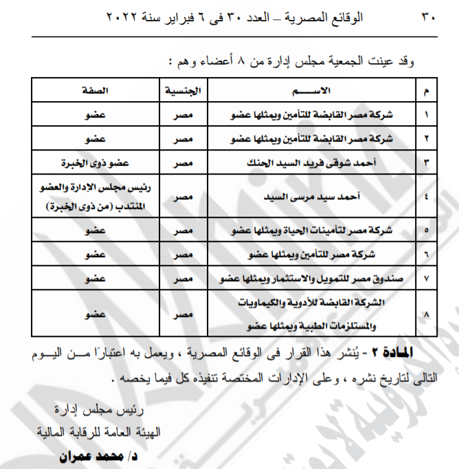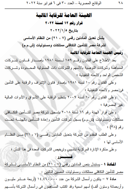 أعلن الدكتور محمد عمران رئيس الهيئة العامة للرقابة المالية، اليوم الأحد، عن صدور القرار رقم 12 لسنة 2022، باعتماد تعديل المادتين رقمي (7، 21) من النظام الأساسي لشركة مصر للتأمين التكافلي ممتلكات ومسئوليات.
