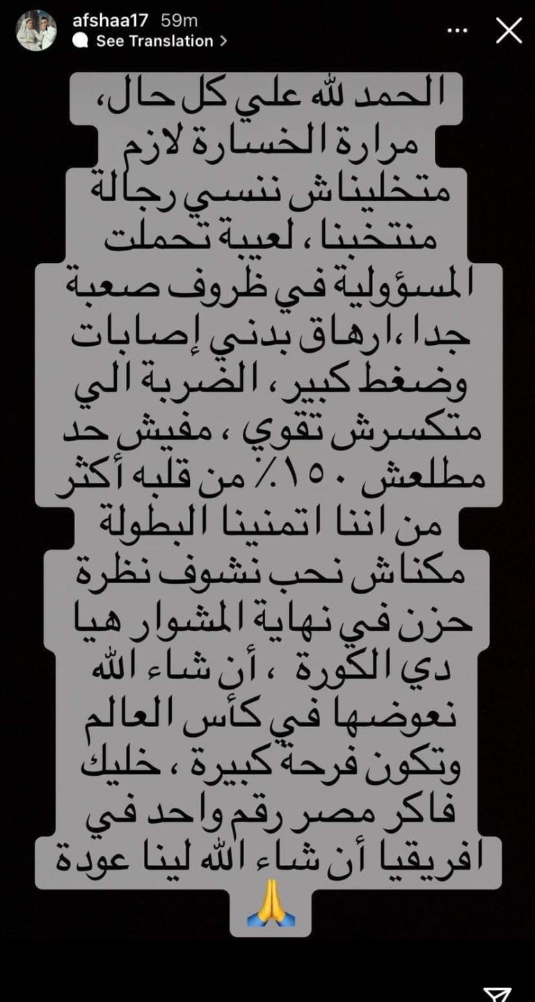 وكتب «أفشة» عبر حسابه الرسمي على موقع التواصل الاجتماعي «إنستجرام»: «الحمد لله على كل حال مرارة الخسارة لازم متخليناش ننسى رجالة منتخبنا لاعيبة تحملت المسؤولية في ظروف صعبة جدا، إرهاق بدني وإصابات وضغط كبير، الضربة اللي متكسرش تقوي، مفيش حد مطلعش أكثر من 150% من قلبه».