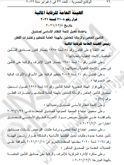 أعلن الدكتور محمد عمران رئيس الهيئة العامة للرقابة المالية، عن قراره رقم 2108 لسنة 2022، بالموافقة على اعتماد تعديل لائحة النظام الأساسي لصندوق التأمين الخاص والزمالة للعاملين بالهيئة العامة للتحكيم واختبارات القطن، وفقًا لما نشرته أسواق للمعلومات.