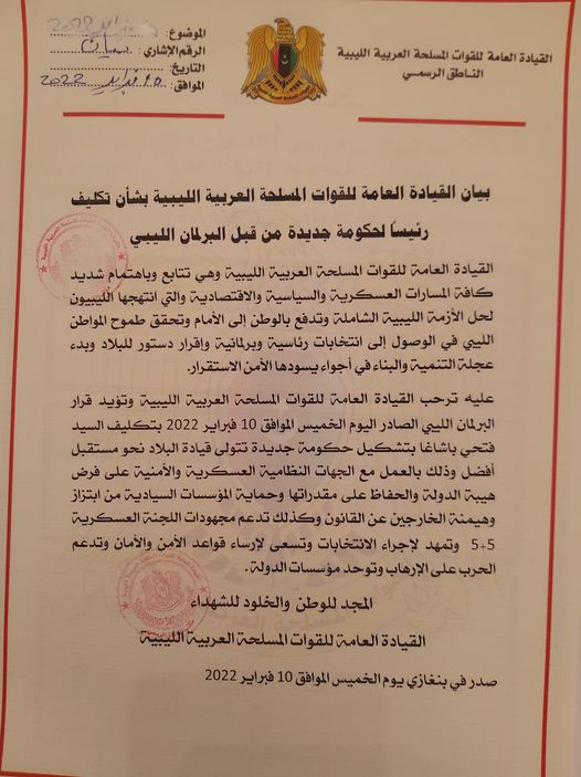 وعليه ترحب القيادة العامة للقوات المسلحة العربية الليبية وتؤيد قرار البرلمان الليبي الصادر يوم الخميس، بتكليف السيد فتحي باشاغا بتشكيل حكومة جديدة تتولى قيادة البلاد نحو مستقبل أفضل، وذلك بالعمل مع الجهات النظامية العسكرية والأمنية على فرض هيبة الدولة والحفاظ على مقدراتها، وحماية المؤسسات السيادية من ابتزاز وهيمنة الخارجين عن القانون، وكذلك تدعم مجهودات اللجنة العسكرية 5+5، وتمهد لإجراء الانتخابات وتسعى لإرساء قواعد الأمن والأمان وتدعم الحرب على الإرهاب وتوحد مؤسسات الدولة.