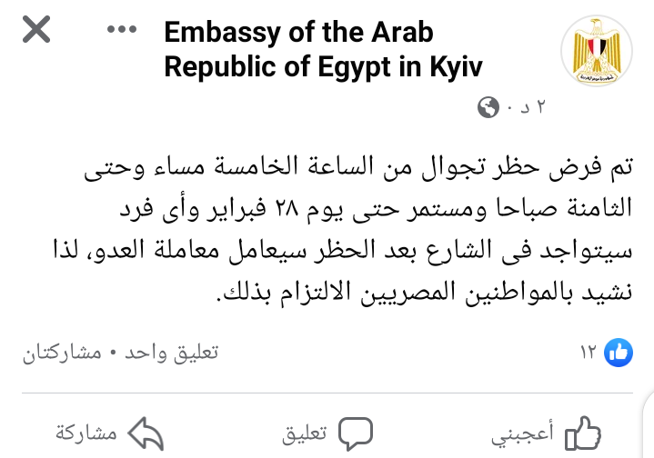 أعلنت السفارة المصرية بأوكرانيا فى بيان لها عن أنه تم فرض حظر تجوال من الساعة الخامسة مساءًا وحتى الثامنة صباحًا ومستمر حتى يوم 28 فبراير وأى فرد سيتواجد فى الشارع بعد الحظر سيعامل معاملة العدو، لذا نشيد بالمواطنين المصريين الالتزام بذلك.