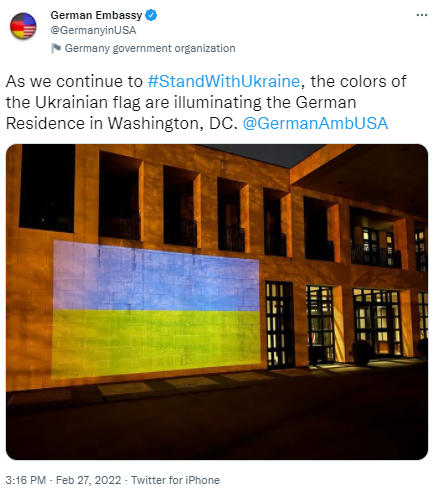 وحرصت السفارة الألمانية في واشنطن على وضع العلم الأوكراني على مقر الإقامة الألماني، ونشرت صورته عبر موقع التواصل الإجتماعي «تويتر».