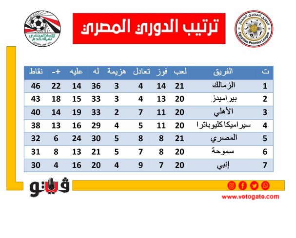 ترتيب مجموعة التتويج في الدوري الممتاز بعد فوز الزمالك أمام المصري