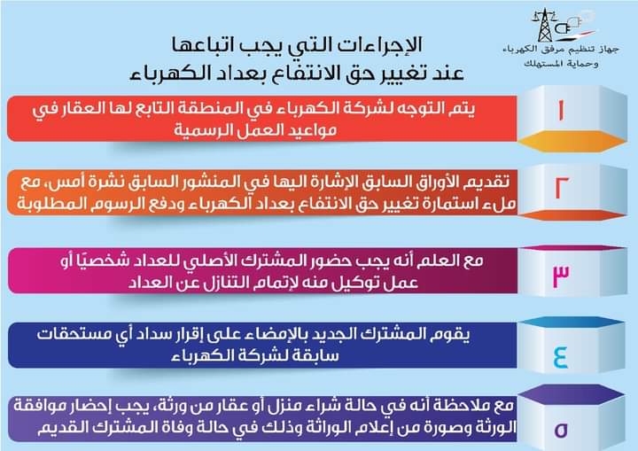 وتجدر الإشارة أن جهاز مرفق الكهرباء سبق ونشر خطوات تغيير حق الانتفاع بعداد الكهرباء، وتتمثل في الآتي: