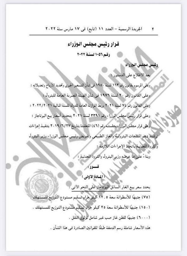نشرت الحريدة الرسمية، قرار رئيس مجلس الوزراء رقم 1056 لسنة 2022، بتحديد سعر بيع الغاز السائل "البوتاجاز".